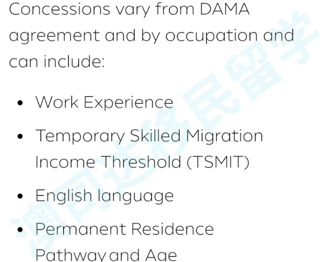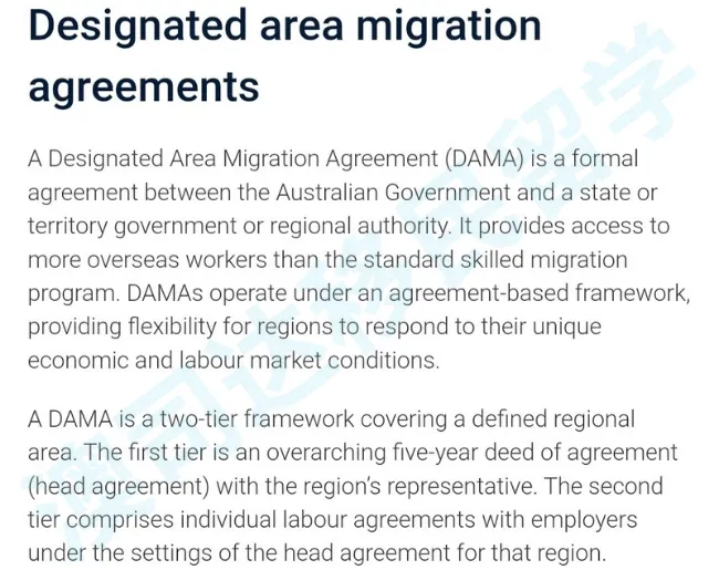 DAMA即指定地区的移民协议(Designated Area Migration Agreement),由澳洲联邦政府与各地区、州或领地等地方政府之间签署,帮助雇主担保海外技术工人,以填补当地职位空缺。准确说,DAMA是雇主担保的低配版,申请人不能自行申请,需要雇主拿到地方政府背书,再提出申请。和普通雇主担保类比,DAMA降低了技能、语言和收入的要求,没有特定的职业清单,更有概率拿身份,签证类别有以下三种: