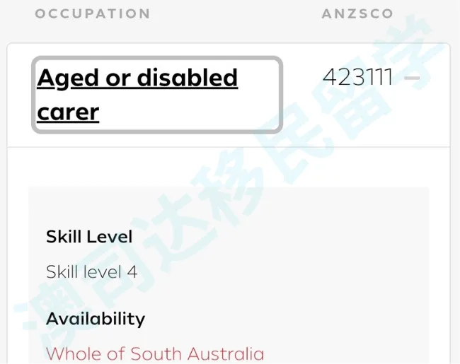 以老年或残疾护理人员(Aged or Disabled Carer)这个职业为例,作为低技能等级4、职位不在任何移民局职业列表上,本身是无法通过技术类签证移民
